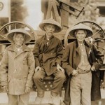 Three elderly Chinese railroad workers photographed next to a parade float celebrating the anniversary of the Transcontinental Railroad, 1919. Taken…