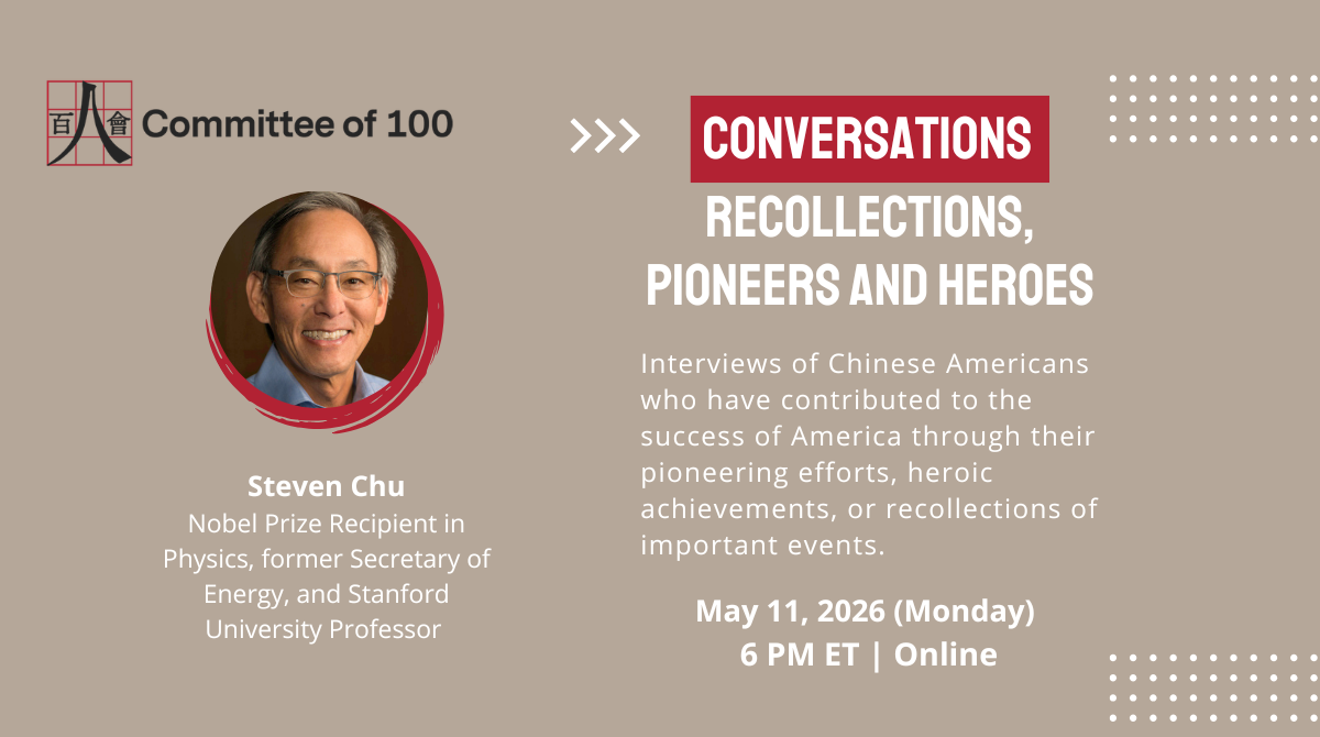 We are pleased to invite you to attend our 13th Committee of 100 Conversations – “Recollections, Pioneers and Heroes” event on May 11, 2026 that will feature Professor Steven Chu, Nobel Prize Recipient in Physics, former Secretary of Energy, and Stanford University professor.