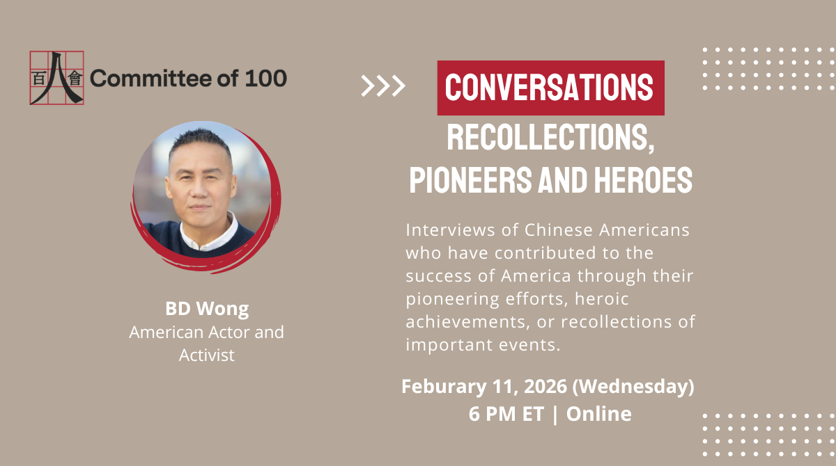 This Committee of 100 Conversations program features interviews of Chinese Americans who have contributed to the success of America through their pioneering efforts, heroic achievements, or recollections of important events. Each interview will feature a live broadcast. The video and podcast recordings of the interview will be made available as part of a library of the interviews.