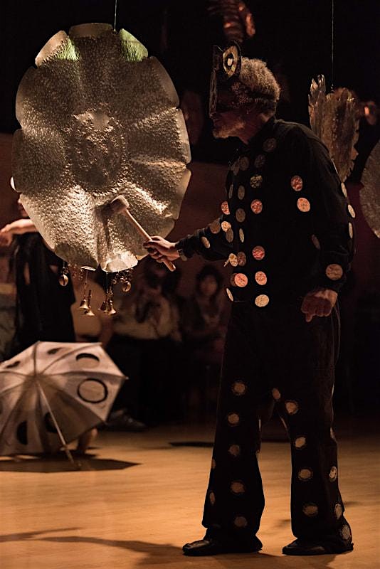 It will feature a collaboration of the wide-ranging movement of Chihiro Cute-Beat, who combines Asian traditional, and experimental dance with hip-hop vitality, and Amir Bey’s Astro-based performance art poetry and costumes, in the environment of Mooncalf’s recent exciting retrospective group exhibition, with a special performance of creative music by Saco Myojo on mbira.