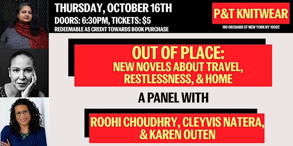 P&T Knitwear is pleased to welcome Roohi Choudhry, author of Outside Women, Karen Outen author of Dixon, Descending, & Cleyvis Natera, author of Neruda on the Park, for a panel on travel, restlessness, and home within their novels.
