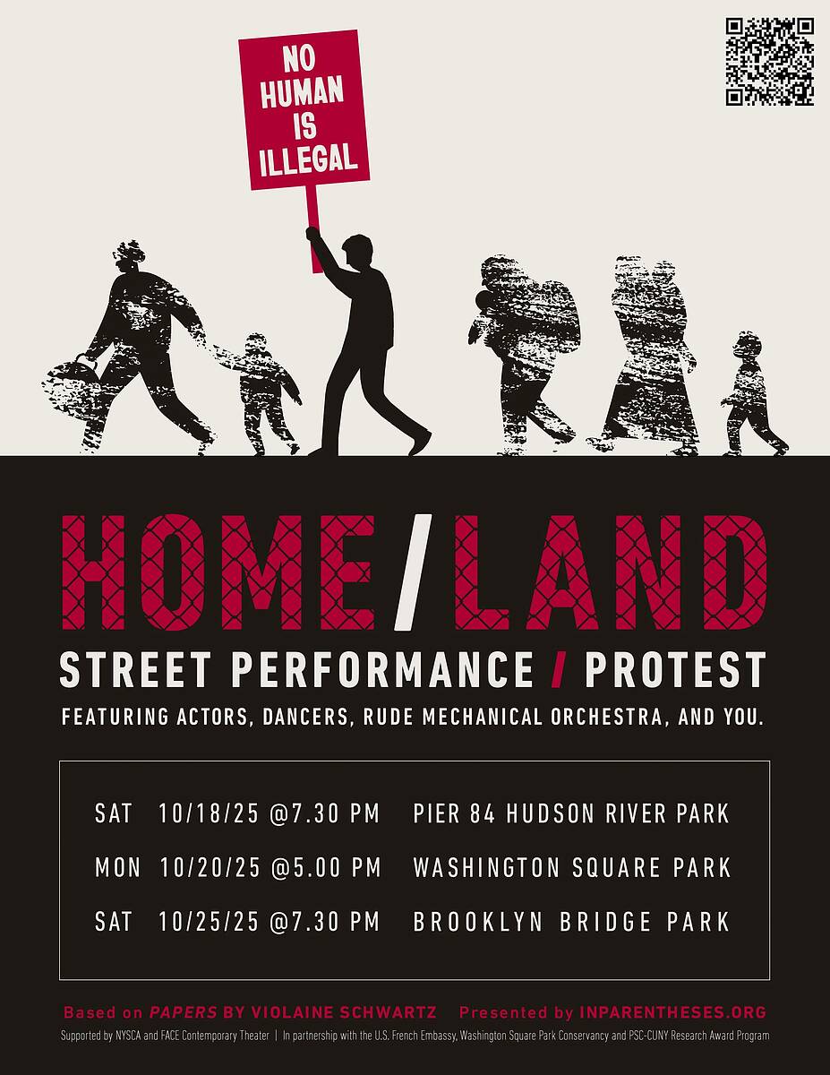 Featuring NYC’s own Rude Mechanical Orchestra! Directed by Marion Schoevaert and Danny Bryck in collaboration with choreographer Hussein Smko, projection designer Young Cheong, photographer Oscar Castillo, filmmaker Irina Patkanian, and Ali Andre Ali, Heather Holmes, Crystal Marie Stewart, Mari Vial-Golden, and Aaron Michael Zook. Based on Violaine Schwartz’s book “Papers,” translated by Christine Gutman. Follow us on IG @homeland.nyc.