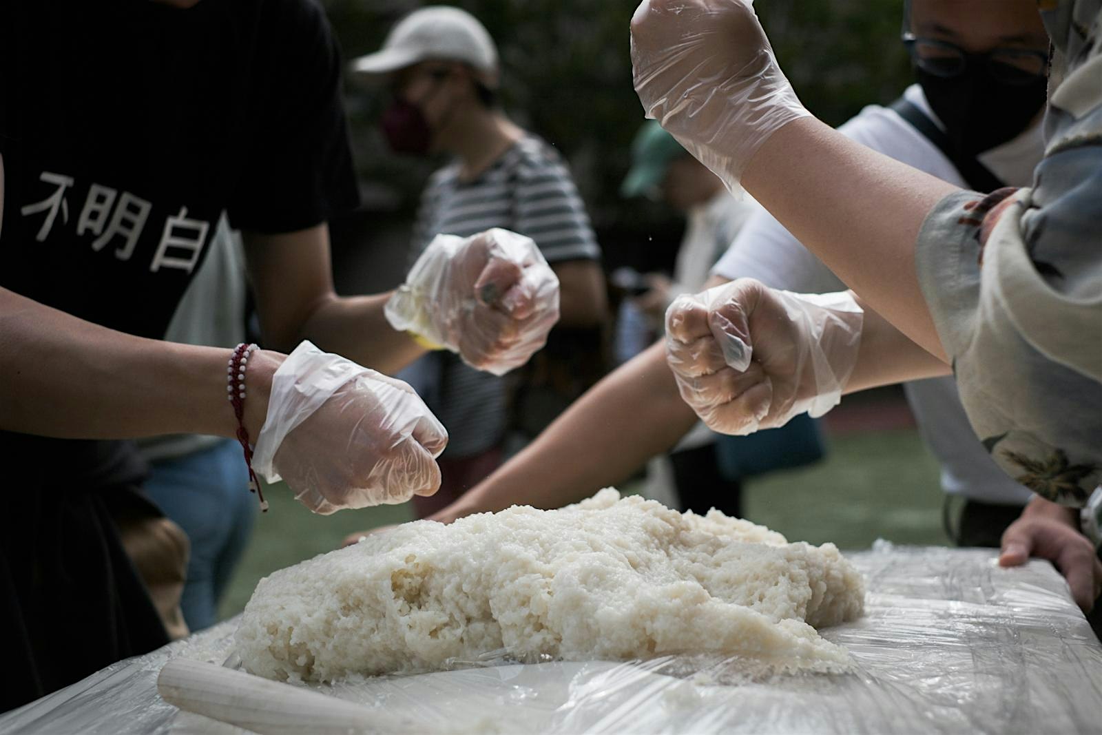 The Ciba Punch 女拳手打糍粑 is a public performance series that invites community members to punch steamed sticky rice into rice cakes. Ciba is a kind of Chinese rice cake that is eaten with brown sugar and other dips. In bringing this food-making process to the public, we hope to reclaim the feminized labor of cooking in domestic spaces and foster cross-cultural connections and movement building. Spiritual Figures, led by Julia Santoli, symbolize queer feminist ancestors and our future selves. They will roam around the punchers to provide sonic, somatic, and spiritual guidance.