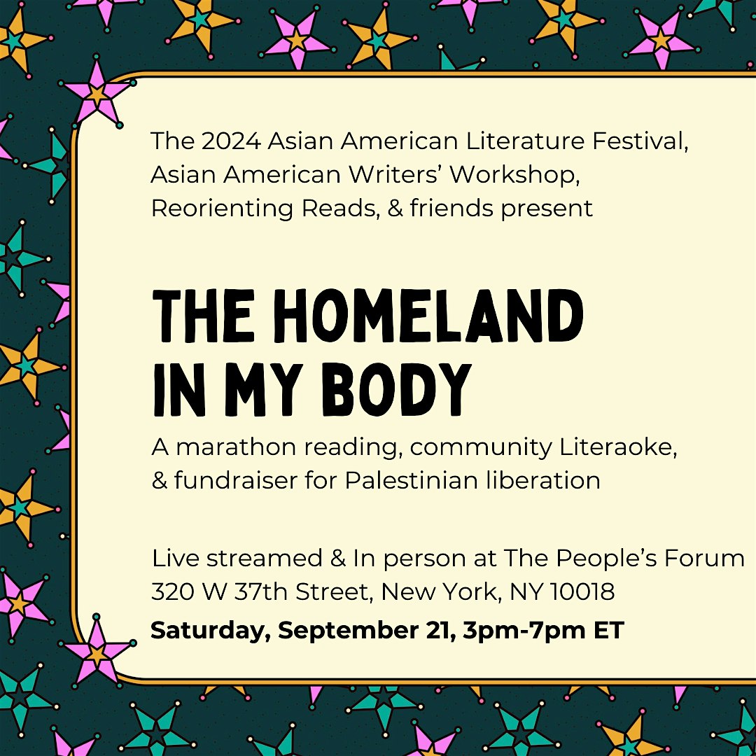 Organized by the Asian American Writers’ Workshop, Reorienting Reads, and our friends and associates, we invite you to join us for a marathon reading uplifting and celebrating Palestinian voices as part of the 2024 Asian American Literature Festival. In the midst of profound sorrow, we seek spaces of joy and kinship, resistance and solidarity, and we look forward to joining in this space of listening and learning. Readers include Leena Aboutaleb, Rasha Abdulhadi, Hannah Lilith Asadi, Farah Barqawi, Tarik Dobbs, Irene Hsu, Inam Kang, Sofia Koyama, and Fargo Nissim Tbakhi.
