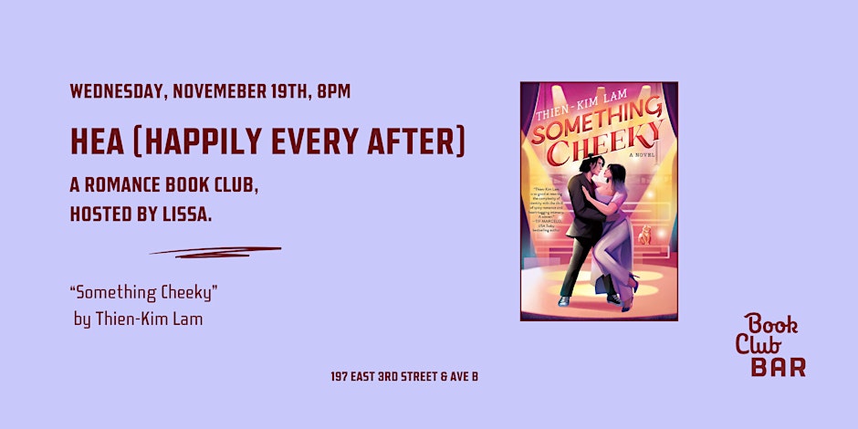 Book Club Bar 197 East 3rd Street, New York, NY, United StatesBook Club Bar's in-person romance book club! We're reading "Something Cheeky" by Thien-Kim Lam A steamy new rom-com from the popular author of Happy Endings and Full Exposure, where two friends get the opportunity to work together on their dream project—a Cinderella rock musical with an all-Asian cast—and discover that falling in love was the […]